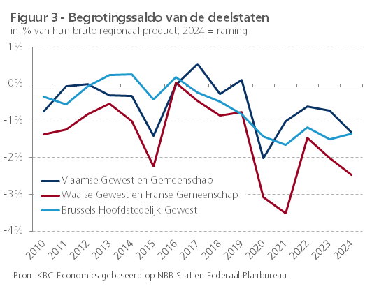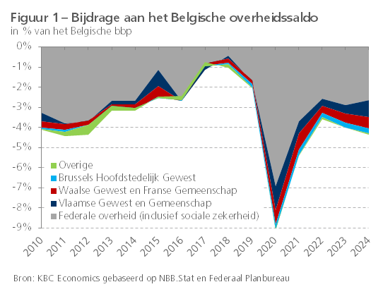Een en ander neemt niet weg dat het overgrote deel van het gezamenlijk tekort zich nog altijd op het federale niveau bevindt. In 2024 was bijna twee derde van het Belgische tekort voor rekening van de federale overheid (inclusief sociale zekerheid) en ruim een derde voor rekening van de drie deelstaten. Concreet bestond het gezamenlijke tekort van 4,4% van het bbp in 2024 voor 2,7 procentpunten bbp uit het tekort van de federale overheid (inclusief sociale zekerheid). Vlaanderen (Vlaamse Gewest en Gemeenschap), Wallonië (Waalse Gewest en Franse Gemeenschap) en Brussel (Hoofdstedelijk Gewest) droegen dat jaar respectievelijk 0,8, 0,6 en 0,3 procentpunt bbp bij tot het gezamenlijke Belgische tekort.