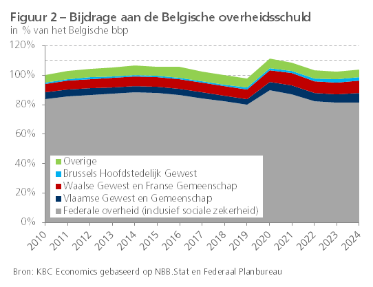 De bijdrage van de (voornaamste) gemeenschappen en gewesten tot de gezamenlijke Belgische overheidsschuld liep op van iets meer dan 11 procentpunten bbp in de jaren vóór de pandemie tot 17,4 procentpunten bbp in 2024. De bijdragen van Vlaanderen, Wallonië en Brussel bedroegen dat jaar respectievelijk 6,7, 8,4 en 2,3 procentpunten bbp. De bijdrage van de federale overheid (inclusief sociale zekerheid) piekte in 2020 op 89,9 procentpunten bbp en viel daarna terug tot 81,4 procentpunten bbp in 2024 (zie figuur 2). Hoewel het aandeel afneemt, bevindt het overgrote deel van de Belgische overheidsschuld (een aandeel van 78% in 2024) zich nog op het federale niveau.