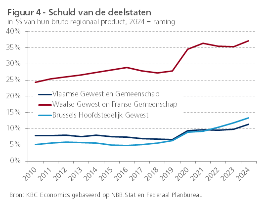 De budgettaire situatie van de Belgische overheid is onhoudbaar, niet alleen op het federale niveau maar ook in de deelstaten. In dit Economisch Bericht belichten we de ontwikkeling van de regionale overheidsfinanciën vanuit verschillende perspectieven, daarbij gebruik makend van recent door het Instituut voor de Nationale Rekeningen (INR) geactualiseerde cijfers. Concreet kijken we naar de bijdrage van de deelstaten (Vlaanderen, Wallonië en Brussel) tot de gezamenlijke Belgische overheidsfinanciën en naar de regionale budgettaire toestand (tekort en schuld) uitgedrukt in verhouding tot enerzijds het bruto regionaal product en anderzijds de regionale ontvangsten.