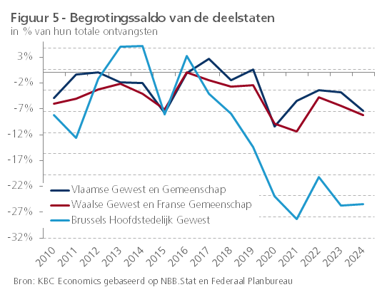 Doorgaans drukt men de begrotingssaldi van de deelstaten eerder uit in procent van hun respectievelijke totale ontvangsten, dit om een beeld te geven van het tekort of overschot ten aanzien van de budgettaire omvang van de deelstaten. Zo bekeken oogt het begrotingscijfer van Brussel veel minder fraai en is wel een meer duidelijke ontsporing zichtbaar (zie figuur 5). Het gewest liet in 2024 een tekort optekenen dat overeenkomt met liefst 25,4% van zijn ontvangsten. Dat is ruim hoger dan dat van Vlaanderen en Wallonië, waar het tekort (gewest en gemeenschap samen) in 2024 respectievelijk 7,4% en 8,2% van de ontvangsten bedroeg. Ter vergelijking: in 2019, vóór het uitbreken van de pandemie, hadden Brussel en Wallonië een tekort van 14,4% en 2,4% van hun ontvangsten, Vlaanderen een licht overschot van 0,6%.
