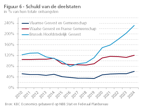 De forse verslechtering van de regionale financiën laat zich ook zien in de schuldcijfers (zie figuur 6). Eveneens afgezet tegenover de totale respectievelijke regionale ontvangsten bedroeg de schuld in 2024 in Vlaanderen 61,2%, in Wallonië 121,3% en in Brussel 231,5%. Opnieuw presteert hier vooral Brussel slecht: de toename van de schuldratio tegenover 2019 was er met 119 procentpunten veel sterker dan in Vlaanderen (+27 procentpunten) en Wallonië (+32 procentpunten).