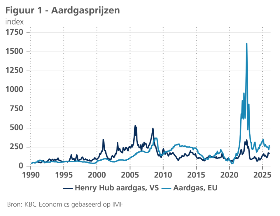 Naar verwachting zullen de consumptieprijzen voor energie in de komende maanden lager blijven dan een jaar geleden, doch in mindere mate dan het er omstreeks de jaarwisseling naar uit zag. De energieprijsinflatie zal dus een minder grote negatieve bijdrage tot de algemene inflatie leveren dan tot voor kort verwacht. Daarom hebben we onze verwachting voor het gemiddelde inflatiecijfer van 2026 lichtjes opgetrokken van 1,7% tot 1,8%. Voor 2027 handhaven we onze verwachting van een gemiddelde inflatie van 1,9% in de eurozone.