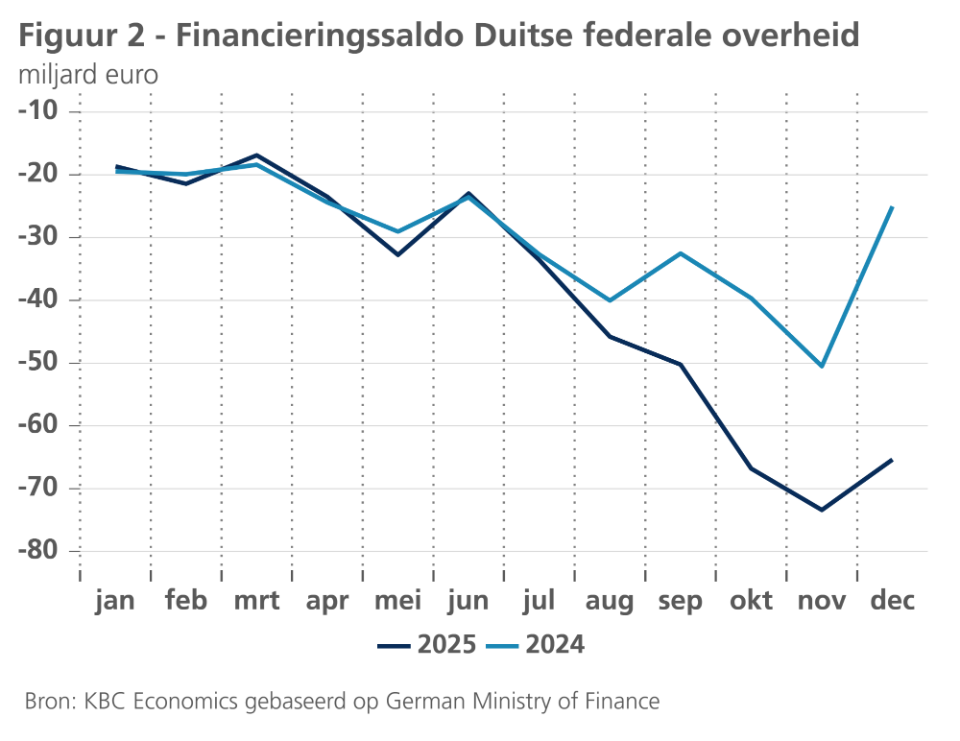 Dat laatste is heel waarschijnlijk te danken aan de begrotingsstimulering, die in het vierde kwartaal eindelijk uit de startblokken geraakte. Doordat de begroting 2025 pas in september 2025 door het Duitse parlement werd goedgekeurd is de tekortfinanciering, waarvoor de forse versoepeling van de grondwettelijke schuldenrem het pad al in maart 2025 had geëffend, pas dan beginnen toenemen (zie figuur 2). In tegenstelling tot de twee voorgaande kwartalen leverde de Duitse economie daarmee opnieuw een positieve bijdrage tot de economische groei in de eurozone (zie figuur 3).