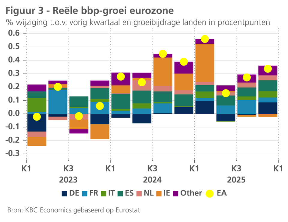 Van de grote(re) landen was de groeibijdrage van Frankrijk het kleinst. De lichte versteviging van de groei van de gezinsconsumptie was er onvoldoende om de geringere groeibijdrage van de investeringen en van de overheidsconsumptie te compenseren. De reële bbp-groei bleef er zodoende beperkt tot 0,2%. Ten slotte valt op dat de Ierse economie, die in 2024 en begin 2025 nog een uitzonderlijk grote positieve groeibijdrage leverde, in de tweede jaarhelft van 2025 een lichtjes negatieve groeibijdrage heeft geleverd. Exclusief Ierland bedroeg de bbp-groei in de eurozone in het vierde kwartaal 0,4% in de plaats van 0,3%.