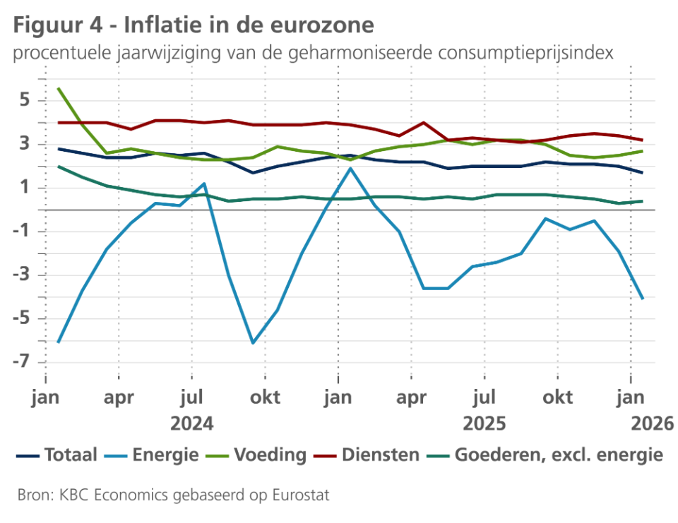 Volgens de flashraming is de inflatie in de eurozone in januari gedaald tot 1,7%, komende van 2,0% in december. Ondanks de sterke prijsstijging van ruwe olie en aardgas in januari was de sterke daling van de energieprijsinflatie (van -1,9% in december 2025 tot -4,1% in januari) de belangrijkste oorzaak van de inflatieafkoeling (zie figuur 4). De daling van de energieprijsinflatie weerspiegelt de hogere energieprijzen in januari 2025, die als vergelijkingsbasis voor de inflatie in januari 2026 dienen. Dit basiseffect illustreert hoe de volatiliteit van de energieprijzen het beeld van het onderliggende inflatieverloop blijft vertroebelen.