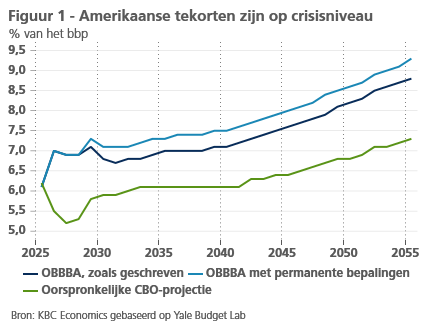 Deze verhoogde uitgaven zullen het begrotingstekort verder opdrijven. De tekorten hadden al onhoudbare niveaus bereikt tijdens de ambtstermijn van Biden. In 2024 bedroeg het tekort 6,2% van het bbp. Volgens de oorspronkelijke prognoses van het CBO zou het tekort in 2027 tot 5,2% zijn gedaald door het aflopen van de Tax Cuts and Jobs Act (TCJA). Daarentegen zou de OBBBA het tekort volgend jaar kunnen laten oplopen tot 7% (zie figuur 1). Alleen tijdens de wereldwijde financiële crisis en de pandemie waren de tekorten hoger dan in de naoorlogse periode (sinds 1946). Op langere termijn zullen de tekorten geleidelijk verder oplopen (tot 8,8% van het bbp in 2055).