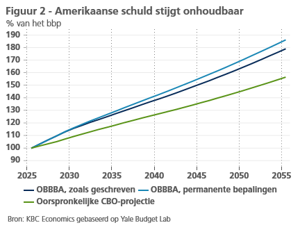 Als de tekorten de komende decennia zo hoog blijven, zal de overheidsschuld van de VS duidelijk oplopen. In de oorspronkelijke prognose van de CBO zou de schuldquote de komende drie decennia al met 56,6 procentpunten van het bbp stijgen. De OBBBA zoals die is geschreven, zou de schuld in dezelfde periode met nog eens 22,6 procentpunten verhogen (zie figuur 2).