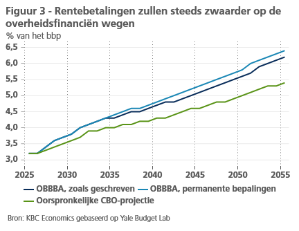 De hogere Amerikaanse schuld zal de rente waarschijnlijk opdrijven. Dit gebeurt om twee redenen. Ten eerste is er bij een toenemende schuld een groter aanbod van schatkistpapier, dat de markt moeilijk kan absorberen. Ten tweede roept een stijgende Amerikaanse overheidsschuld vragen op over de houdbaarheid ervan en dat drijft de risicopremies op Amerikaanse schuld op. CDS-premies stijgen wanneer de verhouding tussen schuld en bbp toeneemt. De CBO schat dat een procentpunt stijging van de schuldgraad de 10-jaarsrente op schatkistpapier met 2,5 basispunten doet stijgen. Hogere schulden en rentetarieven zullen de rentebetalingen door de Amerikaanse overheid opdrijven. De Amerikaanse overheid geeft nu al meer uit aan rentebetalingen dan aan defensie. Als OBBBA-maatregelen permanent worden gemaakt, kunnen de rentebetalingen als percentage van het bbp de komende dertig jaar verdubbelen (zie figuur 3).