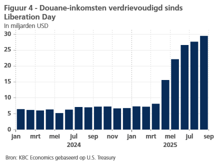 Het is belangrijk op te merken dat bovenstaande projecties van het CBO geen rekening houden met tariefinkomsten. Die zijn sinds ‘Liberation Day’ meer dan verdrievoudigd (zie figuur 4) en zouden dus deels kunnen bijdragen aan de financiering van de belastingverlagingen van de OBBBA. In een brief van juni aan het Congres analyseerde het CBO de mogelijke impact van invoertarieven op de begrotingstekorten. Er werd aangenomen dat de tarieven die in juni van kracht waren (d.w.z. 10% universeel tarief, 30% op China, 25% op goederen die niet aan de USMCA voldoen en 25% op auto's, auto-onderdelen, staal en aluminium) de komende 10 jaar van kracht zouden blijven. Dat zou de schuld van de VS de komende 10 jaar met 3 biljoen USD verminderen. Er is echter grote onzekerheid over de tariefinkomsten gezien de voortdurende flip-flopping door de huidige administratie en de erg grote onzekerheid over het handelsbeleid van de volgende administratie.