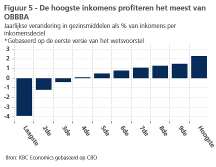 Ten eerste verhoogt de wet de tekorten met belastingverlagingen in plaats van overheidsuitgaven. Belastingverlagingen hebben meestal een lagere multiplicator dan overheidsuitgaven, omdat huishoudens de neiging hebben om een deel van de verlagingen die hen worden aangeboden te sparen. Dat geldt vooral voor rijkere huishoudens, die een veel grotere spaarneiging hebben dan armere. De OBBBA biedt grotere belastingverlagingen aan rijkere huishoudens (zie figuur 5). Volgens het CBO variëren de multiplicatoren van overheidsaankopen van goederen en diensten van 0,5 tot 2,5. Belastingverlagingen voor mensen met lagere en middeninkomens hebben daarentegen een multiplicator van 0,3 tot 1,5. Belastingverlagingen voor mensen met een hoger inkomen hebben slechts een multiplicator van 0,1 tot 0,6.