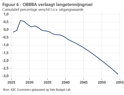 De OBBBA zal grote economische gevolgen hebben. Op de korte termijn kan de VS hierdoor een ‘fiscal cliff’ vermijden en krijgt de economie zelfs een lichte budgettaire impuls. Deze stimulans is echter beperkt gezien de lage multiplicatoren op korte termijn. Op de lange termijn verlaagt de OBBBA waarschijnlijk de economische groei, duwt het de schuld naar een onhoudbaar niveau en belemmert het de inspanningen om klimaatverandering tegen te gaan.