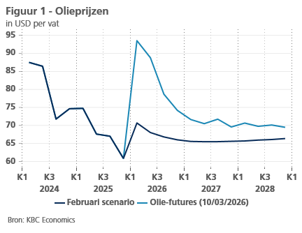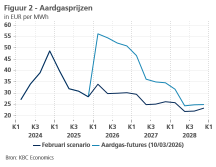 De grootste economische impact zal veroorzaakt worden door de stijgingen van de energieprijzen. De energiemarkten blijven zeer volatiel. De olieprijzen zijn met 32% gestegen ten opzichte van toen we ons scenario maakten in februari (zie figuur 1), terwijl de TTF-aardgasprijzen zelfs met meer dan 67% zijn gestegen (zie figuur 2). De termijnmarkten laten kleinere stijgingen zien, wat erop wijst dat de markten verwachten dat de situatie op middellange termijn zal normaliseren. Een verdere escalatie zou echter extra en aanzienlijke opwaartse druk op de energieprijzen kunnen uitoefenen. Het Midden-Oosten is goed voor ongeveer 30% van de wereldwijde olieproductie en 17% van de wereldwijde aardgasproductie. Ongeveer 20% van de wereldwijde olievoorraden en wereldwijde LNG-stromen verloopt via de Straat van Hormuz. Iran zelf levert 4,5% van de wereldwijde olieproductie en 7% van de wereldwijde aardgasproductie.