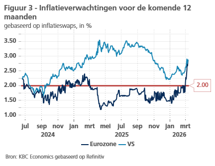 De huidige stijging van de energieprijzen zal waarschijnlijk een grotere impact hebben op de inflatie. Dit geldt met name voor de eurozone, waar de aardgasprijzen aanzienlijk zijn gestegen. In de VS, waar de aardgasmarkt grotendeels binnenlands is, zijn de prijzen onder controle gebleven. De inflatieverwachtingen voor de komende 12 maanden zijn in de eurozone inderdaad sneller gestegen dan in de VS (zie figuur 3). De inflatieverwachtingen op lange termijn blijven voorlopig goed verankerd.