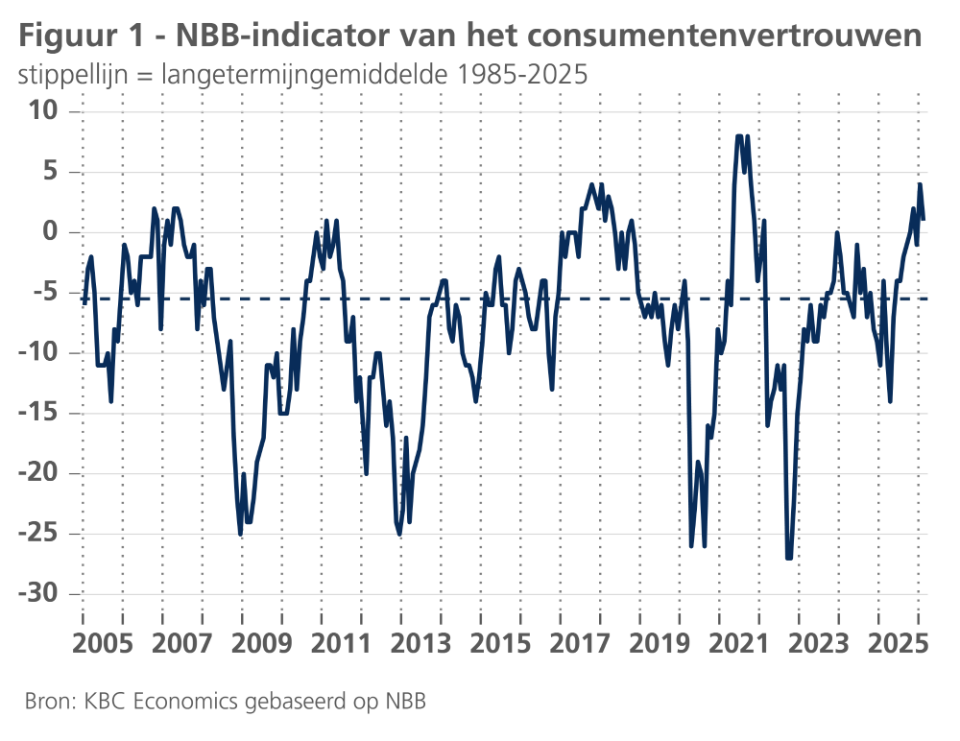 De indicator van het consumentenvertrouwen, maandelijks gepubliceerd dor de Nationale Bank van België (NBB), bereikte begin 2026 één van zijn hoogste niveaus in de voorbije twee decennia, ruim boven het langetermijngemiddelde (zie figuur 1). Algemeen wordt aangenomen dat de graadmeter een goede hulp is bij het vroegtijdig inschatten van de effectieve consumptie van de Belgische huishoudens. In 2025 was de jaargroei van die consumptie met naar raming 1,7% weliswaar hoger dan gemiddeld in de periode 2005-2025 (1,5%), maar voortgaande op de piekende vertrouwensindicator zou men een hoger groeicijfer hebben verwacht. In dit Economisch Bericht geven we duiding bij het opvallend verloop van het consumentenvertrouwen. Een belangrijke vraag daarbij is of de recente piek wijst op een (stevig) aantrekken van de consumptiegroei in de komende kwartalen.