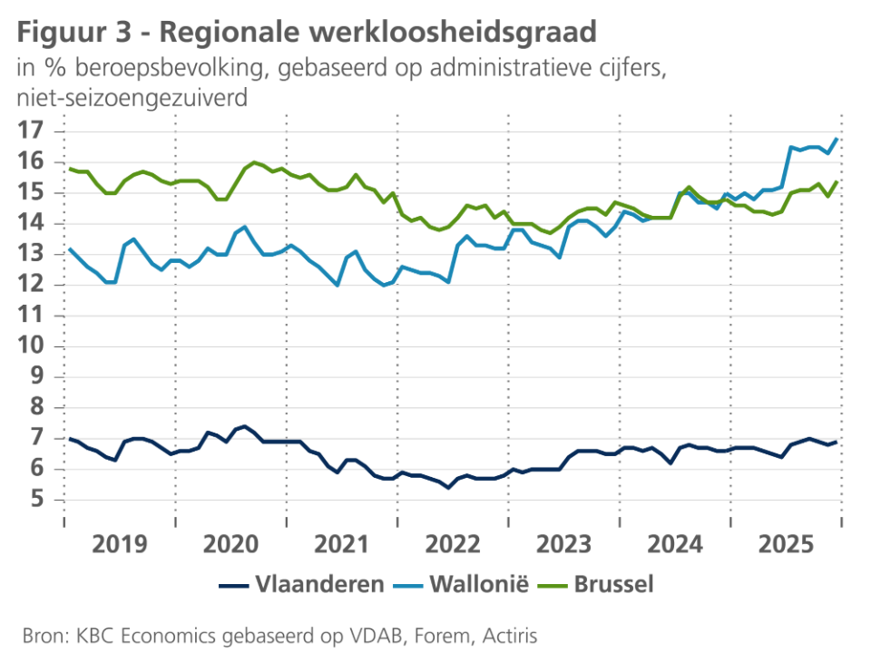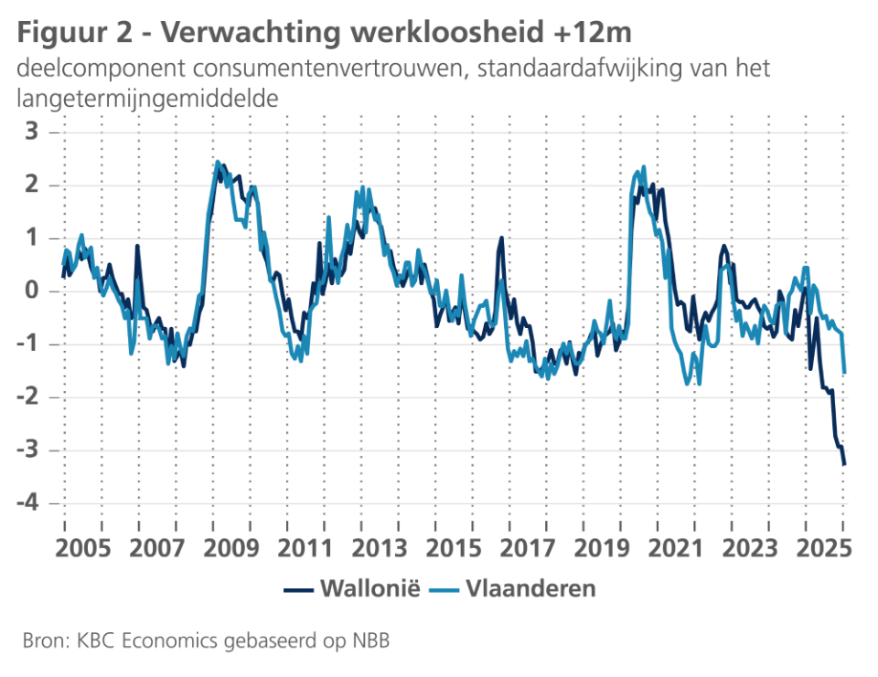 Zoals hierboven al aangegeven, moeten we opletten met vertrouwensenquêtes te zien als goede betrouwbare voorlopende indicator voor het verloop van de effectieve consumptie en, bij uitbreiding, de economische conjunctuur. Zo is er reeds indicatie dat de inperking van de duur van de werkloosheidsuitkering, voorlopig althans, eerder weinig werklozen opnieuw aan het werk heeft gezet. Bovendien contrasteert de forse verbetering van de werkloosheidsverwachting in de consumentenenquête met de recente effectieve ontwikkeling van de regionale werkloosheidsgraad (gebaseerd op administratieve gegevens). In de tweede helft van 2025 werd in alle drie de gewesten een stijging waargenomen en in Wallonië was die zelfs het meest uitgesproken (zie figuur 3).