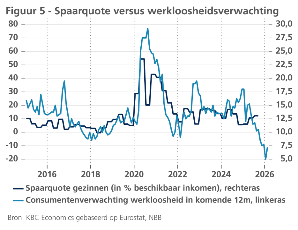 Dat de NBB-vertrouwensindicator de afgelopen maanden, vooral in Wallonië, zo fors is opgeveerd, impliceert niet noodzakelijk dat de effectieve consumptie van de Belgische huishoudens de komende tijd eveneens steviger zal gaan groeien. In principe zorgt een mindere vrees voor werkloosheid voor minder sparen (m.a.w. een lagere spaarquote) en dus meer consumptie. Het voorbije decennium was er weliswaar een redelijk goed verband tussen de spaarquote van de huishoudens enerzijds en de deelindicator van de werkloosheidsverwachting in de NBB-consumentenenquête anderzijds, maar het lijkt eerder onwaarschijnlijk dat de spaarquote de felle verbetering van die verwachting (in eenzelfde mate) zal volgen. Het zou een keldering van de spaarquote ver onder 10% impliceren begin 2026 (zie figuur 5).