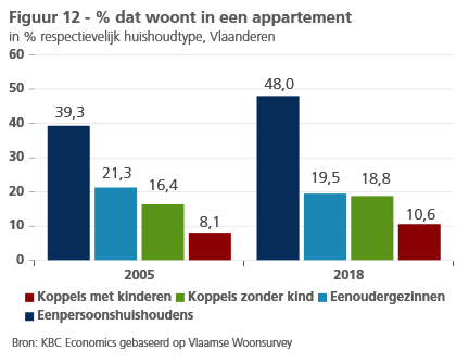 Een belangrijke sociaal-demografische tendens in België betreft het alsmaar grotere absolute aantal alsook groter aandeel alleenstaanden ('éénpersoonshuishoudens') binnen het geheel van de huishoudens. Dat vergt niet alleen een grotere vraag naar woningen, maar ook naar kleinere wooneenheden. Uit de Census-data van Statbel (die om de tien jaar de kenmerken van de bevolking waaronder het wonen in kaart brengen) weten we dat alleenstaanden vaker in een appartement wonen (figuur 10). Dat is vooral bij jongeren zo, maar ook bij alleenstaanden in de oudere leeftijdscategorieën. Koppels met kinderen wonen het minst vaak in appartementen, alleenstaande ouders iets vaker dan koppels zonder kinderen.