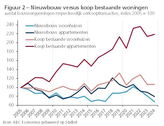 Het lijkt erop dat ditmaal, omgekeerd, de sterke prijsstijging van nieuwbouw, via de opwaartse druk van de bouwkosten, mee een stuwende kracht was achter de eveneens sterke prijsstijging van bestaande woningen. Door de sterk gestegen bouwkosten is nieuwbouw voor veel huishoudens niet langer haalbaar, wat bestaande woningen opnieuw relatief aantrekkelijker maakte. Figuur 2 laat zien dat de vraag naar woningen van de huishoudens de jongste jaren ook relatief meer bestaande woningen betrof. Om de Belgische woningmarkt ‘gezond’ (d.w.z. betaalbaar) te houden, zal erover moeten worden gewaakt dat de bouwkosten onder controle blijven.
