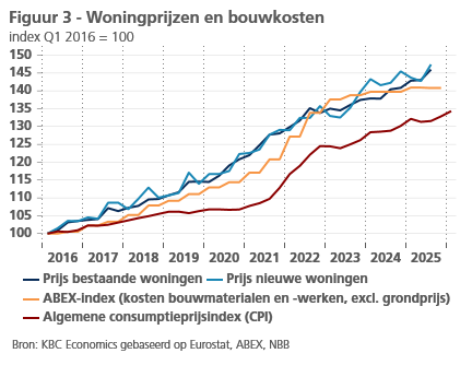 Sinds 2016 vertonen de prijzen van bestaande en nieuwe woningen opnieuw een parallel verloop. Voor beide woningcategorieën trok de prijsdynamiek fors aan, met 46,0% respectievelijk 47,4% tussen begin 2016 en eind 2025. Het valt op dat deze nieuwe prijsboom gepaard ging een forse stijging van de kosten van nieuwbouw (figuur 3). De ABEX-index, die de kosten van bouwmaterialen en -werken weergeeft, steeg sinds begin 2016 sneller (+40,8%) dan de algemene consumptieprijsindex (+32,9%). De ontwikkeling houdt verband met nieuwe vereisten voor nieuwbouw (inzake energieprestaties en veiligheid) en duurdere bouwmaterialen.
