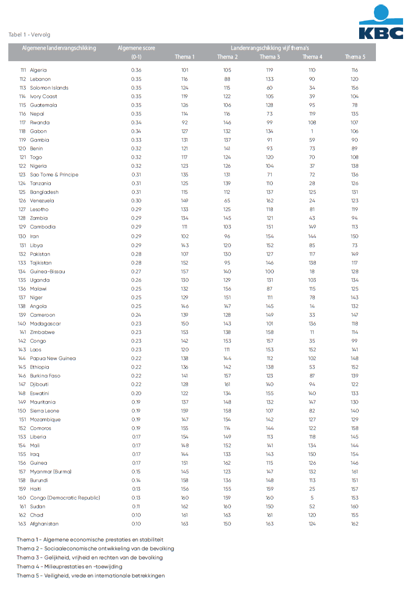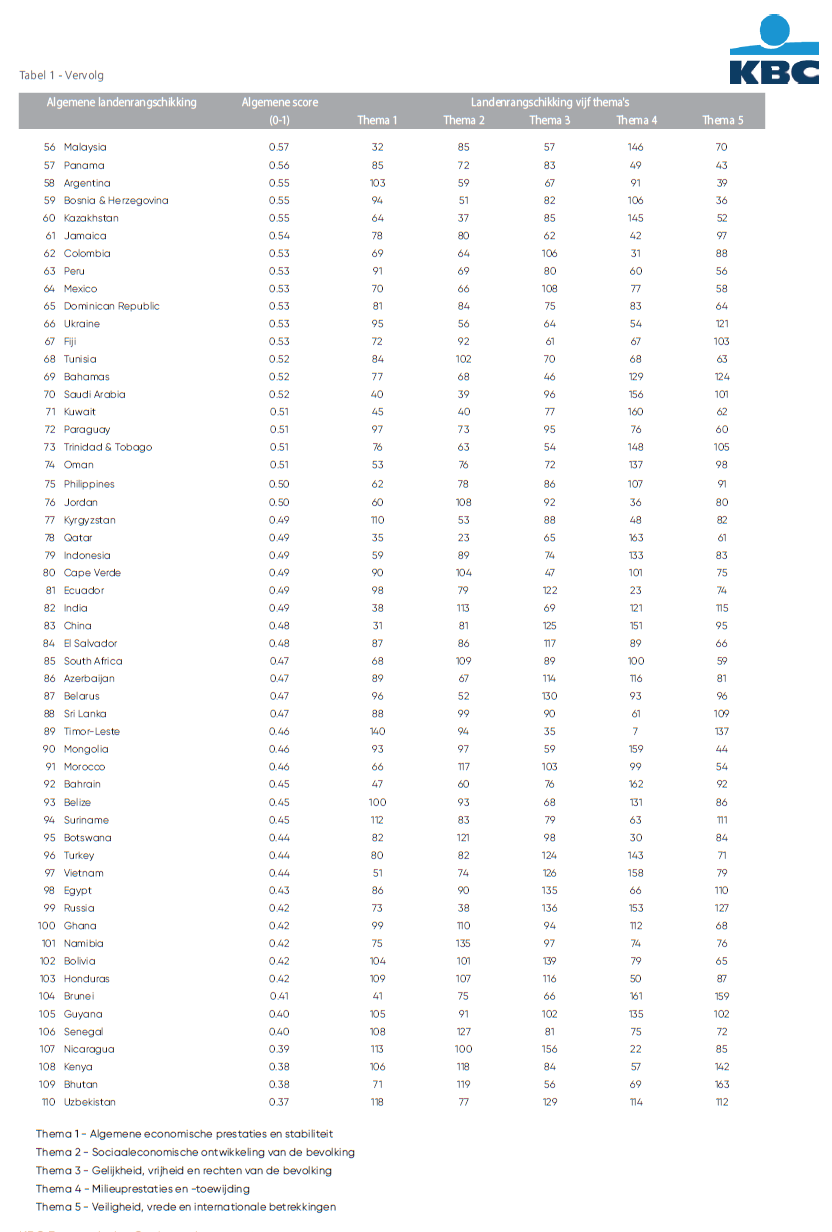 2 Meer detail over de prestaties van België in de algemene landenrankschikking vind je terug in een KBC Economische Opinie die we samen met dit onderzoeksrapport publiceren: "België klimt naar 12e plaats in de KBC Country Sustainability Barometer”, xx februari 2026.