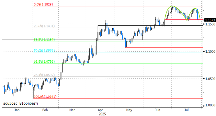 Het commentaar van Bayrou en Merz kreeg gisteren bijval van veel – maar niet alle – andere EU-leiders. Dat schept natuurlijk weinig vertrouwen in de markt. En die heeft in een dunne zomerhandel al niet veel prikkels nodig. Voeg daarbij het verwachtingselement – de markt hield al enige tijd rekening dat de EU een worst-case handelsscenario zou vermijden – en je hebt de perfecte voedingsbodem voor winstnemingen. Europese aandelenmarkten ruilden een 1.3% openingswinst voor een dagverlies. Obligaties herstelden van hun recente bodem, met dalende rentes als gevolg. De euro betaalde de grootste prijs: 1.3% t.o.v. zijn grootste concurrent, de dollar. EUR/USD viel terug van 1.178 tot onder 1.16. De neklijn onder een dubbele-top-formatie op 1.1573 staat onder druk. Vanuit een technisch oogpunt effent een potentiële breuk lager het pad in eerste instantie richting 1.1431 (23.6% dollarherstel op de daling in 2025). De eerste poging vanmorgen blijft voorlopig zonder gevolg. Dit gebeurt overigens tegen de achtergrond van alweer overeind krabbelende Europese beurzen (+1%) en rentes. Het is mogelijk een indicatie dat het huidige (maar in onze visie tijdelijk) verzwakte euromomentum niet volstaat. Of een sterkere Amerikaanse dollar het dan straks overneemt, hangt in belangrijke mate af van de economische update deze week. Van het rapport met openstaande vacatures en consumentenvertrouwen vandaag gaat het morgen over in tweedekwartaalgroeicijfers met aansluitend de Fed-beleidsvergadering richting PCE-inflatiecijfers op donderdag en het arbeidsmarktrapport (juli) op vrijdag. Die laatste zijn cruciale input voor de Fed om de afwachtende houding die ze woensdag allicht herbevestigt, in september al dan niet in te ruilen voor een eerste renteverlaging sinds december 2024.
