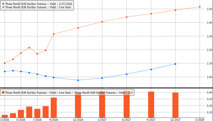 Euribor 3m forward curve eind vorige week (blauw) en vandaag (oranje): radicale herpositionering
