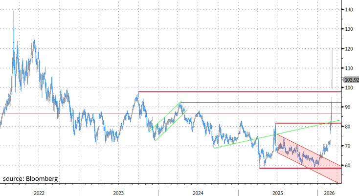 Het conflict in het Midden Oosten gaat zijn tweede week in. Prijsbewegingen op de financiële markten leggen grote zenuwachtigheid bloot. Energie is en blijft de eerste barometer. Een vat ruwe Brentolie werkte zich vorige vrijdag door de $90-grens. Vanmorgen gaat de symbolische barrière van $100 eraan. De kaap van $120, het hoogste sinds de nadagen van de Russische inval in Oekraïne, bleef maar nipt buiten schot. Gerelateerde producten zoals aardgas trekken vanmorgen nog maar eens 15% hoger (Nederlandse TTF).