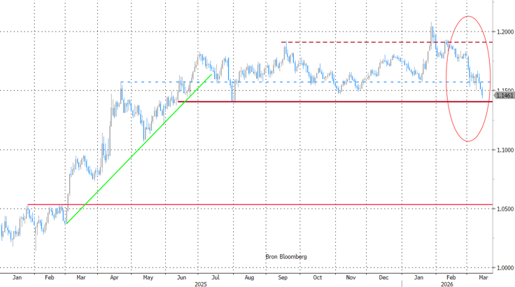 De verhaallijn is niet zozeer politiek, maar in belangrijke mate ‘economisch’, met de marktfocus op de energiekost. De VS (energie-onafhankelijk) is veel minder kwetsbaar voor onzekerheid over energiebevoorrading en hogere prijzen. De vrees dat het conflict, en dus de energie-onzekerheid, langer kan aanslepen dan eerst verhoopt, zorgt nu voor een versnelling van USD-aankopen of, misschien beter, van verkoopdruk op munten met een zwak energieprofiel zoals de euro en de yen.