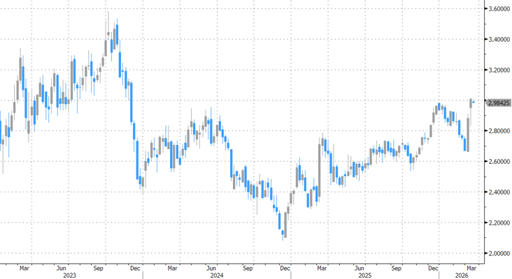 De Europese tienjaarswaprente sloot afgelopen vrijdag voor de eerste keer sinds november 2023 boven de kaap van 3%, ofwel de 61.8% tegenbeweging op de lange daling van oktober ’23 tot december ’24. Als die grens sneuvelt, is er enkel nog intermediaire weerstand in de buurt van 3.2% en 3.4% richting de meerjarige post-pandemische top van 3.58% (oktober 2023). De belangrijke Europese referentie noteerde amper twee weken geleden nog aan het laagste niveau in vier maanden beneden 2.7%. Dat niveau viel samen met de onderkant van een opwaarts hellend trendkanaal. Maar het herstel sindsdien is veel meer dan alleen technisch. Het beeld voor de Duitse tienjaarsrente is nog dwingender. Het slot vrijdag (2.98%) was al het hoogste sinds 2011.