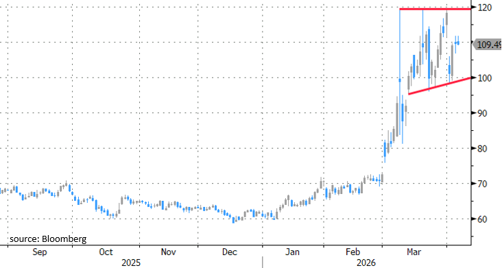 Het biedt comfort aan sommige Fed-beleidsmakers die vrezen voor een ontsporende arbeidsmarkt. Dat blijkt tot nader bericht niet het geval. De tweede pijler van het Fed-mandaat, prijsstabiliteit, vergt op korte termijn mogelijks meer de aandacht. De Amerikaanse centrale bank mist al sinds 2021 systematisch de 2%-inflatiedoelstelling. Zoals haar Europese tegenhanger, waakt de Fed er nu over dat de huidige energieschok zich niet vertaalt in nog verder oplopende inflatieverwachtingen. Het zou een motie van wantrouwen ten aanzien van de monetaire (wereld)autoriteit zijn. Het risico is nochtans zeer reëel. In de ISM-bedrijfsenquête (het Amerikaans equivalent van de PMI’s) lopen de prijsindicatoren op naar de hoogste niveaus sinds 2022. In de maakindustrie is de gecumuleerde toename van de afgelopen twee maand het meest in bijna tien jaar. De dienstensector liet in maart dan weer de grootste maandstijging in 13 jaar optekenen. Het margeabsorptievermogen van bedrijven staat hiermee al onmiddellijk onder druk. De volgende stap zijn hogere prijzen voor de eindconsument. Dan is het niet de vraag “of” maar “wanneer” zich dat uit in de officiële inflatiemaatstaven, zoals de CPI voor maart van aanstaande vrijdag. De hand van de olieprijs, momenteel $110 per vat, zal al zichtbaar zijn in de overkoepelende reeks. De verwachte 3.4% op jaarbasis is een tweejarige top. Het volle effect op de graadmeter die zuivert voor energie en voeding komt met vertraging. Toch klimt deze zogenaamde kerninflatie naar verwachting nu al van 2.5% naar 2.7%.