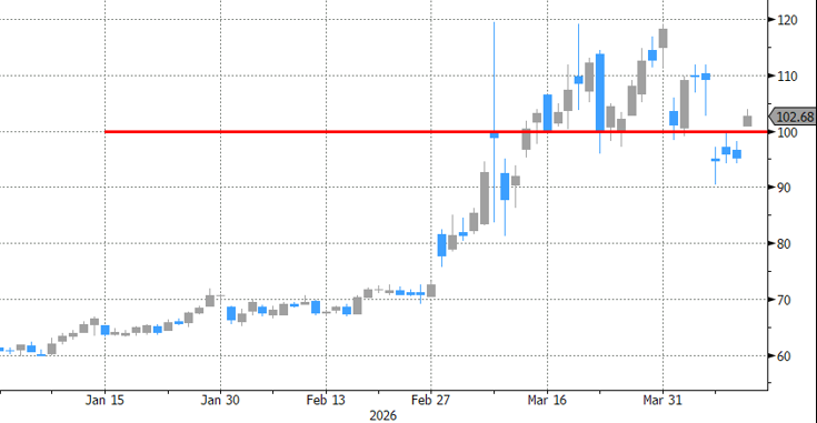 De olieprijs ondervindt vanochtend de grootste marktimpact. De prijs voor een vat Brent ruwe olie (junicontract) stijgt van $94 tot $102. Europese gasprijzen gaan ook zo’n 8% hoger. De belangrijkste Europese beurzen geven 1% terug van de TACO short squeeze van vorige week (+5%). Ze houden zich voorlopig vast aan de resterende onderhandelingstijd van het staakt-het-vuren, maar beseffen dat bijzonder weinig nodig is om daar een eind aan te maken. Europese rentes kruipen enkele basispunten hoger. We zijn het omslagpunt van een korte energiecrisis al even voorbij. Elke dag dat het conflict aansleept met hogere energieprijzen, wordt de impact op het algemene prijspeil en de reële economie groter. Centrale bankiers lieten recent al in hun kaarten kijken. De nieuwe reactiefunctie bestaat uit een snelle, beperkte, verstrakking van het monetair beleid. Zowel als signaalfunctie als om opwaartse inflatierisico’s op te vangen. De Europese geldmarkt is momenteel 50/50 verdeeld over al dan niet een eerste ECB-renteverhoging eind deze maand. Over zomeractie bestaat geen twijfel meer. Deze week passeren onder meer ECB-voorzitster Lagarde en BoE-kopman Bailey de revue op de jaarlijkse IMF/Worldbank-vergaderingen in Washington. Hun toespraken kunnen bepalend zijn voor het verwachtingspatroon. Eén ding is zeker, er zit een stevige bodem onder de rentemarkt. Op de wisselmarkt boekt de dollar beperkte winst dankzij de hogere olieprijs. EUR/USD valt in een beweging die technisch weinig voorstelt terug van 1.1720 richting 1.1680.