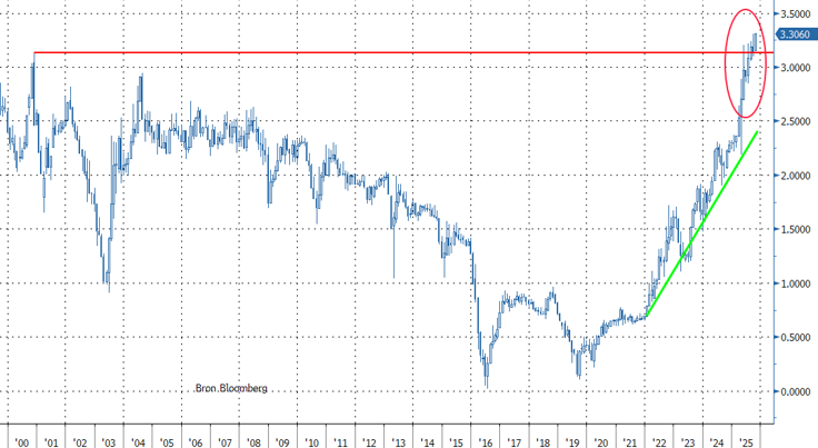 Vrijdag gingen we in op Japans monetair beleid. ‘Normaal’ vielen de dominosteentjes richting een nieuwe 25 bpn renteverhoging eind deze maand. De aanstelling van een nieuwe regeringsleider en eventueel wijzigende fiscale politiek, zorgden wel voor terughoudendheid in de commentaren vanuit de Bank of Japan (BOJ). Dat bleek geen slechte strategie. Ietwat onverwacht kwam Sanae Takaichi als winnaar uit de bus en bijvoorbeeld niet de fiscaal meer voorzichtige Shinjiro Koizumi. Van Takaichi wordt verwacht dat ze een ‘Abenomics’-geïnspireerd beleid wil voeren. Ondanks de hoge schuld blijft het fiscaal beleid stimulerend. Logischerwijs verwacht je dan, zeker in de nieuwe context van inflatie boven 2%, dat de BOJ tegengas geeft. Die is onafhankelijk, maar moet haar inflatiebeleid wel afstemmen met het bredere overheidsbeleid. Hoe dat concreet uitdraait, valt nog te bezien, maar Takaichi liet meer dan eens verstaan dat ze geen voorstander is van een strakker monetair beleid. Dat wordt op eieren lopen voor BoJ-voorzitter Ueda en co dus. De marktreactie vanmorgen toont twee uiteenlopende aspecten. De Japanse beurs ziet een soepel fiscaal en monetair beleid helemaal zitten (Nikkei +4.75%). De yen duikt wel naar een historisch dieptepunt tegen de euro (EUR/JPY 175+). Ook USD/JPY rondt de kaap van 150. De Japanse obligatiemarkt maakt dan weer zich ongerust over de fiscale houdbaarheid. De 30-j rente gaat naar een recordniveau van 3.30% (+14 bpn). Een reflatietrade op de beurs en tegelijk hogere risicopremies aan het lange eind van de curve. Het voelt als een interne contradictie. Interessant om volgen.