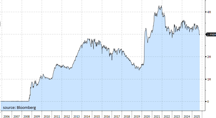 De boodschap van Powell was dan weer glashelder. Op 29 oktober krijgt de preventieve renteverlaging van september (tot 4-4.25%) een vervolg. De Fed-voorzitter onderstreepte de kwetsbare toestand op de arbeidsmarkt waarin een verdere afbrokkeling van vacatures kan uitmonden in stijgende werkloosheid. Die conclusie trekt hij o.b.v. de beperkte en niet-officiële info die hij sinds september ontving. Powell zegt wel dat het gebrek aan data uit de geijkte kanalen de analyse steeds gecompliceerder maakt. Versta: voor december is het nog niet duidelijk wat de Fed zal doen. Wij zetten in op een derde verlaging. Powell had het ook over de afbouw van de obligatieportefeuille (quantitative tightening, QT). Dat proces stopt waarschijnlijk binnen enkele maanden (december?!). Met QT zuigt de Fed liquiditeit uit de markt. Tijdens de vorige episode in 2019 was dat proces mee de aanleiding voor fricties op de geldmarkt, zowat het hart van het financiële raderwerk. De Fed wil dat deze keer vermijden met een proactieve aanpak. Een van de indicatoren die ze daarvoor nauw in het oog houdt is de hoeveelheid reserves die commerciële banken aanhouden bij de Fed. Die teller daalde van ongeveer $4300 miljard naar ondertussen net geen $3000 miljard. Invloedrijk Fed-raadslid Waller stelde begin 2023 10-11% van het bbp voorop als eindbestemming. Aan het bbp-niveau van toen stemt dat overeen met ongeveer $2700 miljard.