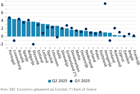 Er waren slechts twee landen, België en Frankrijk, waar de prijzen in Q2 daalden tegenover het vorige kwartaal, zij het beperkt. In België volgde de lichte correctie (-0,1%) op drie eerdere kwartalen van behoorlijke prijsstijging en baart die, ook gezien de volatiliteit van kwartaalwijzigingen, geen zorgen. In vergelijking met veel andere landen is de periode van marktafkoeling in België overigens ordentelijk verlopen. In Frankrijk was de prijscorrectie in Q2 2025 (-0,2%) de zoveelste in een lange reeks, weliswaar een paar keer onderbroken door een positief cijfer. Het niveau van de woningprijzen lag er in Q2 2025 nog 6% onder de eerdere piek van Q3 2022. In negen landen bedroeg de kwartaalstijging van de woningprijzen in Q2 meer dan 3%. In Q1 waren dat er zes. In de groep van sterke stijgers valt Luxemburg op (+4,5%). Nadat de prijzen er tussen eind 2022 en begin 2024 fors waren gecorrigeerd, herstelde de Luxemburgse markt zich traag, gevolgd door een nieuwe correctie in Q1 2025 die nu in Q2 2025 meer dan teniet wordt gedaan. In de groep landen met een meer gematigde prijsstijging in Q2 is de Duitse prijsontwikkeling meldingswaardig. Duitsland was een van de landen waar de afkoeling uitmondde in een stevige prijscorrectie. Na al vier kwartalen op rij van prijsherstel stegen de prijzen er in Q2 verder in een gematigd tempo (+1,1%).