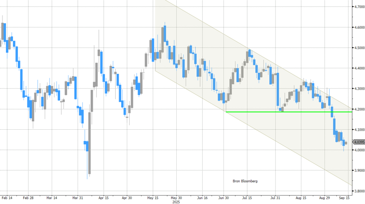 De arbeidsmarkt gaf een nihil obstat om richting neutraal te gaan. De tewerkstelling groeit aan een traag tempo (3-maandsgemiddelde 29 000) en een herziening door het bureau van arbeidsstatistiek toonde een overschatting van de solide groei rond de jaarwisseling (2024-2025). De inflatiekant van het verhaal blijft minder duidelijk. Algemene inflatie steeg met 0.4% m/m en 2.9% j/j (van 2.7%) in augustus terwijl kerninflatie stabiliseerde op 0.3% m/m en 3.1% j/j. Kort door de bocht toonden details dat de inflatie recent niet zozeer resultaat was van het doorrekenen van invoertarieven maar eerder van duurdere binnenlandse diensten. Dat is een ambigue signaal voor de Fed en de markt voelt dat.