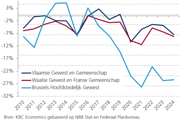 De regionale begrotingssaldi worden doorgaans eerder uitgedrukt in procent van hun respectievelijke totale ontvangsten. Zo bekeken oogt het begrotingscijfer van Brussel veel minder fraai en is wel een meer duidelijke ontsporing zichtbaar. Het gewest liet in 2024 een tekort optekenen dat overeenkomt met liefst 25,4% van zijn ontvangsten. Dat is ruim hoger dan dat van Vlaanderen en Wallonië, waar het tekort (gewest en gemeenschap samen) in 2024 respectievelijk 7,4% en 8,2% van de ontvangsten bedroeg. Eveneens afgezet tegenover de totale respectievelijke regionale ontvangsten bedroeg de schuld in 2024 in Vlaanderen 61,2%, in Wallonië 121,3% en in Brussel 231,5%.