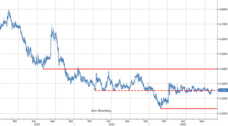 Zoals steeds is de vraag ‘what’s next?’ Daarvoor is het uitkijken naar de persconferentie van voorzitter Glapinski straks. Vorige maand kwam hij relatief mild uit de hoek en gaf aan dat een verdere verlaging tot 4% mogelijk is, al sprak hij zich niet uit over de timing. Die 4% is waarschijnlijk nog boven de neutrale rente, maar vanaf dat niveau komt de NBP in de finetuningsfase terecht. De zloty was recent een oord van rust. Alle vergelijkingen lopen mank, maar de ervaring in Tsjechië (en in mindere mate Hongarije) toont dat een voorzichtige versoepeling, maar met een positieve reële rentebuffer boven de inflatie, niet zo slecht hoeft te zijn voor de munt. We verwachten dat de zloty minstens stand houdt binnen de KT-handelsband EUR/PLN 4.31/4.22. De jaartop (voor de zloty) bevindt zich op EUR/PLN 4.1275. Dat blijft een harde noot om kraken (sterke weerstand voor zloty).