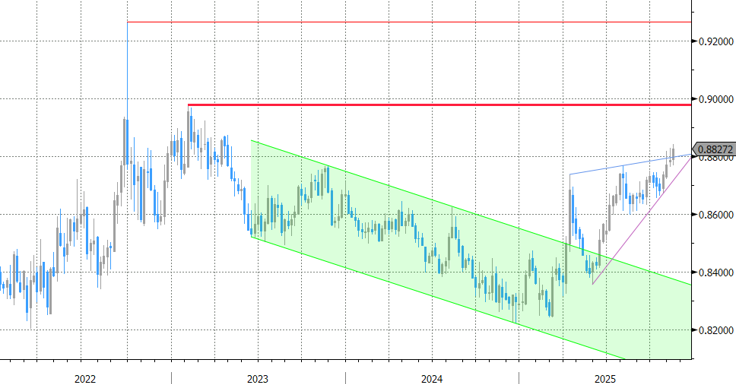 De combinatie van verlies aan rentesteun, zwakke cijfers en de aanstaande belasting-verhogende begroting eisen hun tol voor sterling. EUR/GBP sloot gisteren aan het hoogste niveau sinds april 2023. De volgende technische referentie bevindt zich op 0.8979, de 2023-top.