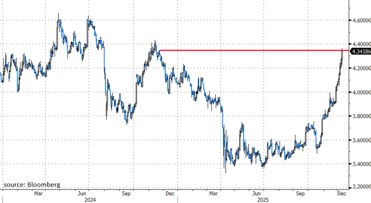 De langetermijnrentes kennen hun link naar de monetaire wereld via de obligatieaankopen van de ECB. Die begonnen in 2014 en piekten in 2022 met een portefeuille van +/- 5000 miljard. Dat was meer dan 40% (!) van de toenmalige uitstaande schuld in de eurozone. Door de afbouw van de portfolio in functie van vervallen obligaties staat de teller vandaag op €3900 miljard en <30%. Dit proces gaat in 2026 door. Dan komen zo’n €500 miljard eerder opgekochte obligaties op vervaldag. Met de ECB als de grote afwezige verdwijnt een koper van formaat, op het moment van stijgende financieringsnoden van de overheden. De vergrijzing, het klimaat, economische weerbaarheid en onafhankelijkheid of defensie; u kiest het maar. Duitsland, de voormalige heimat van fiscale discipline, verhoogde zopas het geschatte te ontlenen bedrag voor volgend jaar: €180 miljard is een nieuw record. Budgettair heeft het daartoe wel de ruimte. Maar elders barsten de begrotingstekorten nu al uit hun voegen en het politiek draagvlak om daar iets aan te doen ontbreekt uit vrees voor een electorale kaakslag. Frankrijk, België, de VS, Japan of het VK; u kiest het maar. We pikken er voor de gelegenheid het Verenigd Koninkrijk uit. De rentes schieten er vanmorgen met meer dan 10 bpn hoger omdat de minister van Financiën overweegt sommige belastingverhogingen in de aanloop naar de begroting van 2026 te schrappen. Dat ging in tegen de verkiezingsbeloftes maar werd als noodzakelijk beschouwd om het begrotingsgat te dichten. Een bittere pil maar wel een die de bezorgdheden van de markt rond de openbare financiën kalmeerde.