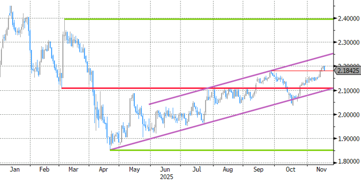 De Europese Commissie publiceerde gisteren haar halfjaarlijkse economische prognoses. In de herfstupdate legt ze het groeipad voor de euro zone hoger dan in het lenterapport. Voor de periode 2025-2027 staat nu 1.3%-1.2%-1.4% in de tabellen ipv 0.9%-1.4%-1.4%. De Commissie verwijst naar robuustere groei tot dusver. In eerste instantie via een sterke stijging van uitvoer in de aanloop naar de invoering van Amerikaanse tarieven, maar nadien dankzij algemene weerbaarheid ondanks de onzekere globale context. Eerste indicatoren voor de maand oktober, zowel van de Commissie als bijvoorbeeld van PMI-vertrouwensindicatoren, suggereren dat het groeimomentum behouden blijft en zelfs versnelt. Een sterke arbeidsmarkt en stijgend beschikbaar inkomen helpen alvast de consumptiepoot. Op vrijdag verwacht de markt bevestiging van dit scenario met de PMI-enquête voor de maand november. De groeiprognoses van de EC zijn positiever dan die van de ECB in de september. Toen zinspeelde de centrale bank op 1.2%-1%-1.4%. Marginale opwaartse revisies zijn mogelijk als de ECB op 18 december voor een laatste keer dit jaar verzamelt. In combinatie met een min of meer stabiel inflatiepad rond de 2%-inflatiedoelstelling, zetten de groeiverwachtingen de beleidsrentestabiliteit van de centrale bank kracht bij. Europese geldmarkten houden amper nog rekening met een bijkomende renteverlaging de volgende 12 maanden (30% kans). De Europese 2-j swaprente stijgt voorzichtig verder en bereikte gisteren voor het eerst sinds begin april het 2.2%-niveau. Voorlopig zien we het nog steeds meer als een uitbodeming aan het korte eind van de curve. Voor een sterke directionele beweging hoger moet de markt beginnen rekening houden met hogere beleidsrentes. Die zijn op vandaag nog niet aan de orde.