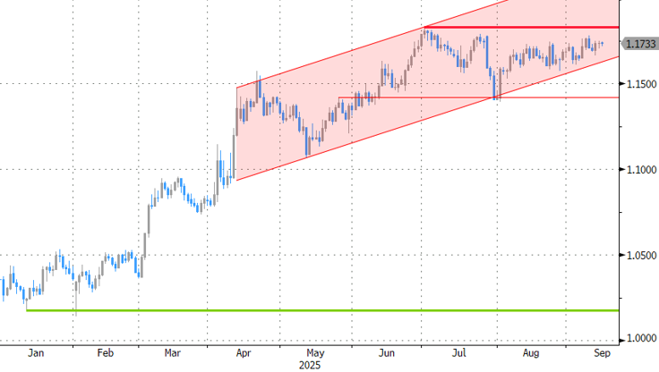 Komt er voor EUR/USD dan hulp uit de dollarkant van de vergelijking? De Amerikaanse centrale bank verlaagt woensdag zo goed als zeker de beleidsrente voor de eerste keer in 9 maanden. En dat doet ze waarschijnlijk nog eens in november en december (tot 3.5%-3.75%). Maar of de neus van de Fed en de markt voor 2026 al meteen in dezelfde richting zullen wijzen is onzeker. De discrepantie tussen de dot plot van in juni en de Amerikaanse geldmarkt (3% in 2026) is groot.