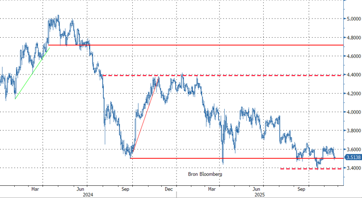 Amerikaanse PMI’s wezen op solide groei. De algemene activiteitsindicator voor november klokte af op 54.8, het beste niveau in vier maanden, vooral gedragen door de dienstensector (55). S&P schat de vierderkwartaal groei in op 2.5% (op jaarbasis) na de PMI-enquêtes van deze en vorige maand. Orderboekjes groeien fors en verwachtingen voor het komende jaar verbeteren aanzienlijk verder, onder meer door het einde van de shutdown en de hoop op steun van de Fed. Jobcreatie bleef matig door de oplopende kostendruk. Eén van de scherpste prijsversnellingen van de voorbije drie jaar sijpelt ook door naar de consument. Onder meer tarieven worden met de vinger gewezen. Op het eerste gezicht is dit geen rapport dat roept om monetaire steun. Toch gaf invloedrijk Fed-voorzitter John Williams vrijdag aan dat hij op korte termijn nog ruimte ziet om het nog steeds (matig) restrictief beleid wat verder terug te schroeven. De markt pikte het signaal op en schat de kans op zo’n renteknip in december in op 70%. De rentevork komt dan op 3.5%-3.75%. Als de Amerikaanse economie zich ook daarna kranig houdt en de inflatie (iets) te hoog blijft, wordt het voor de Fed niet zo vanzelfsprekend om begin volgend jaar snel richting de neutrale 3% te gaan.