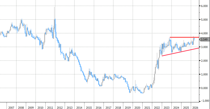 In absolute termen volgt de Belgische 10j-rente dit jaar vooral het globale verhaal, met een stevige opsprong na de start van de oorlog in het Midden-Oosten. Ze steeg voor het eerst sinds 2012 tot 3.75% en ging daarmee iets boven de vorige top uit 2023 (3.70%). Het structurele verhaal van stijgende risicopremies in afwezigheid van ECB-obligatieaankopen is hier van tel. Relatief gezien noteert de Belgische rente 10j-rente slechts een handvol basispunten beneden die van dat andere Europese zorgenkind, Frankrijk. Het verschil ten opzichte van de veilige Duitse haven blijft al meer dan twee jaar min of meer stabiel tussen 50 en 60 basispunten. In tegenstelling tot bijvoorbeeld de periode van de Europese schuldencrisis differentiëren investeerders op vandaag nog niet echt op basis van (krediet)risicoprofiel. Het is waarschijnlijk eerder de vraag wanneer dan of dat uiteindelijk zal gebeuren.