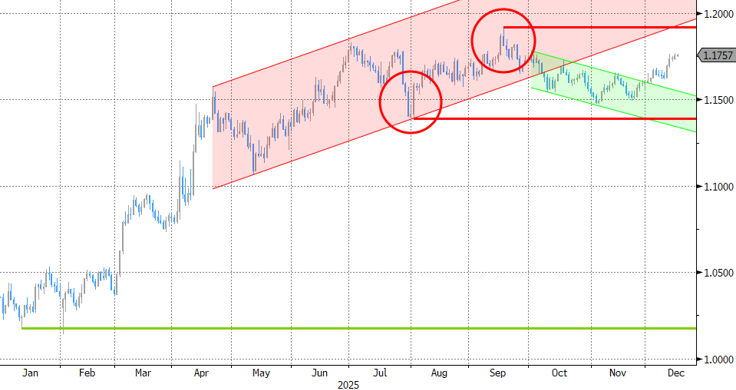 Markten liggen niet wakker van de PMI’s. Ze schetsen een beeld dat perfect aansluit bij de standvastige ECB-koers en tonen geen haast om al verder te dagdromen over de timing van een eerste renteverhoging. Bovendien ligt het zwaartepunt deze namiddag met de publicatie van een half Amerikaans arbeidsmarktrapport voor de maand oktober en de volledige versie voor november. Tijdens de persconferentie van de Fed-voorzitter Powell vorige week pikte de markt vooral de signalen op die pleitten voor een voortzetting van de beleidsnormalisatiecyclus lager in het eerste kwartaal van 2026. Die reactiefunctie indachtig zien we asymmetrische risico’s waarbij de markt vooral gevoelig is aan een zwakker cijfer. Het korte eind van de Amerikaanse rentecurve en de dollar zijn zo kwetsbaar voor vervolgverliezen na vorige week.