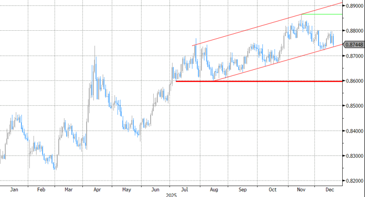 De positievere economische lezing gaf Europese rentes en EUR/USD een duwtje in de rug. Ze kantelen de balans van de volgende ECB-zet, zij het na een lange pauze, voorzichtig verder in de richting van een renteverhoging ipv renteknip. Tussen het perscommuniqué en Lagarde’s persbabbel publiceerde de Amerikaanse statistische dienst het inflatierapport voor de maand november. Hoewel onvolledig omwille van de government shutdown en het ontbreken van oktobercijfers valt op dat zowel hoofd- als onderliggende kerninflatie op jaarbasis sterk terugviel: tot respectievelijk 2.7% en 2.6% (tov marktconsensus van 3.1% en 3%). Via lagere Amerikaanse rentes (tot 5 basispunten aan het korte eind van de rentecurve) hielpen de inflatiecijfers EUR/USD van 1.1720 tijdelijk richting 1.1760. De ECB-beslissingen betekenden aanvankelijk ook een einde aan de dagdaling in EUR/GBP. Het Britse pond profiteerde na een renteknip met 25 basispunten tot 3.75% door de Bank of England. De beslissing was even nipt als vorige keer (5-4) maar BoE-voorzitter Bailey wisselde van kamp. Britse rentes en het pond veerden toch op omdat drie van de vijf pleitbezorgers voor een renteknip vandaag meer bewijs zoeken om dat gedrag in januari te herhalen. Ofwel van het disinflatieproces (vooral lonen) ofwel van een verzwakking van de arbeidsmarkt. De data zullen meer dan eens bepalen over de snelheid van het normalisatiepad lager. De beperkte ruimte richting neutraal betekent dat de cijfers over de nodige overtuigingskracht moeten beschikken. De Europese rentebeweging en het euromomentum vielen stil nadat Lagarde de verzamelde pers resoluut liet verstaan dat de centrale bank omwille van de onzekere toekomst geen forward guidance kan geven.