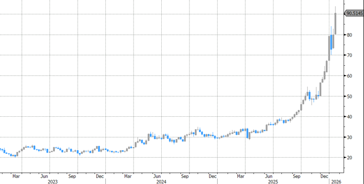 Het risicosentiment op de beurzen blijft ondanks (geo)politieke onzekerheid positief. De hoeveelheid aan verstorende factoren (Oekraïne, Venezuela, Iran, Groenland, Trump vs Powell, tarievenoorlog,…) is zo groot dat hij blijkbaar verlammend werkt. Tegelijkertijd rollen er economisch gezien geen wielen van de wagen. Er is wel sprake van rotatie. De techreus Nasdaq (+1%) en S&P 500 (+1.2%) doen het minder goed dan de industriële Dow Jones (+2.26%), de Russell 2000 (kleinere Amerikaanse bedrijven, +7%) of de EuroStoxx 50 (+4%).