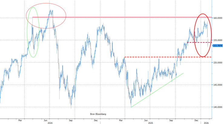In het tweede en derde kwartaal van 2025 werd USD/JPY getroffen door besluiteloosheid. Later kwam de yen in de verdrukking. De BoJ-rentenormalisatie verloopt tergend traag, ook al bevindt inflatie (ex. verse voeding) zich sinds april 2022 (op een maand na) boven de 2%-doelstelling. De yen gaat dus al een hele tijd gebukt onder een stevig negatieve reële rente. Op de toelichting na de rentebeslissing vorige week vrijdag (onveranderd 0.75%) was BoJ-voorzitter Ueda weinig concreet over verdere verhogingen. De BoJ wil meer bevestiging dat de opwaartse loonprijsspiraal inflatie ‘definitief’ in de buurt van 2% houdt. Ondertussen moet de centrale bank rekening houden met de nieuwe politieke context. De voluntaristische fiscale intenties van premier Takaichi zorgen voor fors hogere Japanse risicopremies, een valversnelling van de yen en risico’s op hogere (ingevoerde) inflatie. Volgens de economische schoolboekjes vraagt zo’n combinatie (expansief fiscale beleid en een zwakke munt) om een strakker monetair beleid. Nog niet in Japan. De verwevenheid tussen de regering en de centrale bank is groter dan in andere ontwikkelde economieën. De BoJ vindt dat de yen niet verder mag/moet zakken, maar het is niet de bedoeling dat te snelle monetaire verstrakking de groei-intenties van de regering onderuit haalt en de kostprijs van schuld fors opdrijft. Tegelijk lieten de Japanse autoriteiten recent verstaan dat ze de yen scherp in het oog houden. Opvallend: na de persconferentie van Ueda veerde de yen op. Naar verluidt kwam het ministerie van Financiën koersen opvragen in de wisselmarkt, meestal een waarschuwing in de aanloop naar interventies. Meer nog: ook de New York Fed zou vrijdag in de markt de USD/JPY-koers “gecontroleerd” hebben. Japanse beleidsmakers verwezen tijdens het weekend naar nauwe samenwerking met de VS. Dit alles suggereert de optie van gecoördineerde interventies. Afgezien van beperkte actie in 2011 (Fukushima) is dat van 1998 geleden. Niet niks dus voor de wisselmarkt.