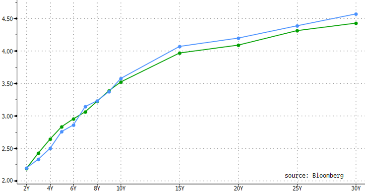 Franse (groen) en Italiaanse (blauw) rentecurve: meeste korte looptijden in Frankrijk nu al hoger dan in Italië.