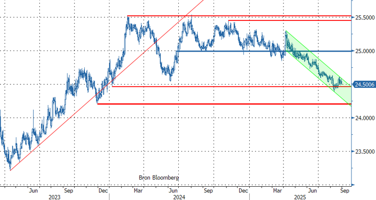 Het CNB-beleidscomité van voorzitter Michl houdt zich ondertussen aan de communicatielijn dat het beleid voldoende restrictief moet blijven. De inflatie (2.7% in juli) blijft in het bovenste helft van de 1-3% doelzone en de CNB ziet heel wat opwaartse inflatierisico’s: van koppig hoge diensteninflatie en een krappe arbeidsmarkt tot oplopende vastgoed gerelateerde prijsstijgingen. Ondanks een naar EU-normen beperkt begrotingstekort (orde van grootte 2% dit jaar) waarschuwt de CNB ook voor de inflatoire risico’s van het te gul fiscaal beleid. In dit verband zijn de verkiezingen van begin oktober nog een bron van onzekerheid. Moraal van het (monetaire) verhaal voor de munt: de kroon behoudt uitzicht op een aanzienlijke positieve reële beleidsrente. In deze context is de CNB waarschijnlijk ook niet echt ongelukkig met een relatief sterke kroon zolang dit volgens de weg van de geleidelijkheid verloopt. Afgezien van een eventuele opstoot van algemene risicoaversie kan de kroon zijn herstel voortzetten. Vanuit technisch oogpunt opent een volgehouden breuk van de zone EUR/CZK 24.50 het pad richting 24.20 (dieptepunt van december 2023).
