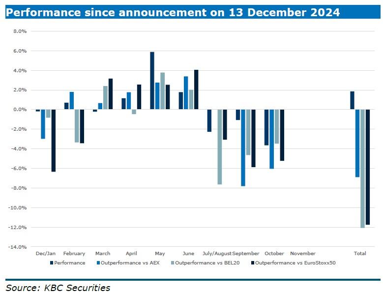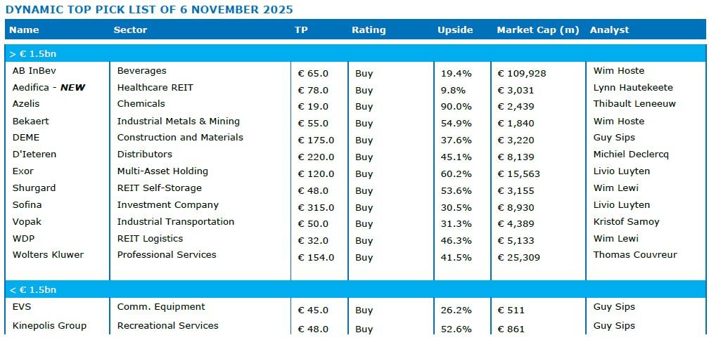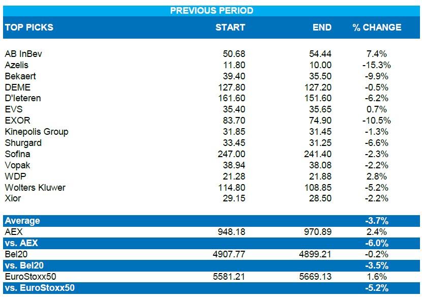 Sinds de laatste publicatie daalde de waarde van de KBC Securities Top Pick List met 3%, terwijl de indices AEX en Eurostoxx50 respectievelijk stegen met 2,4% en 1,6% en de Bel20 vlak bleek. De slechtst presterende bedrijven waren Azelis (-15,3%), Exor (-10,5%) en Bekaert (-9,9%). De beste performers waren AB Inbev (+7,4%), WDP (+2,8%) en EVS (+0,7%).